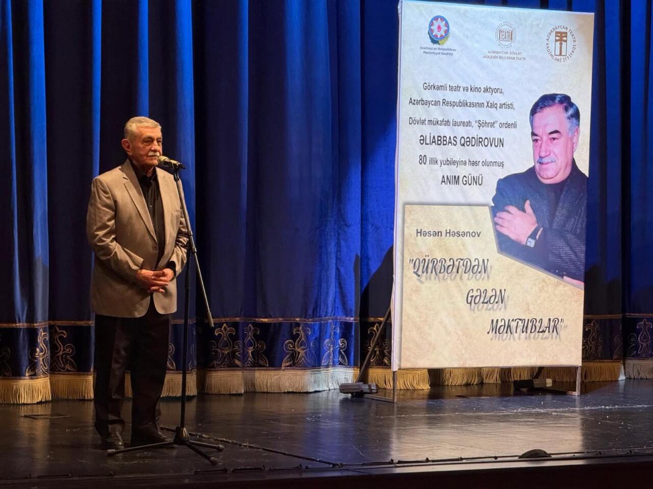 Akademik Milli Dram Teatrında Azərbaycanın görkəmli sənətkarı, Xalq artisti Əliabbas Qədirovun 80 illik yubileyi münasibətilə anım tədbiri keçirilib.