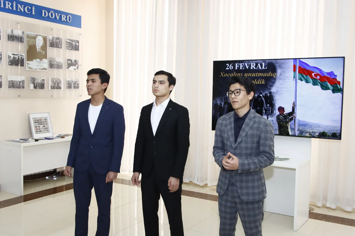 İştirakçılar əvvəlcə Mədəniyyət Mərkəzinin foyesində Xocalı soyqırımına həsr olunmuş fotoşəkillərdən ibarət sərgi ilə tanış olublar.