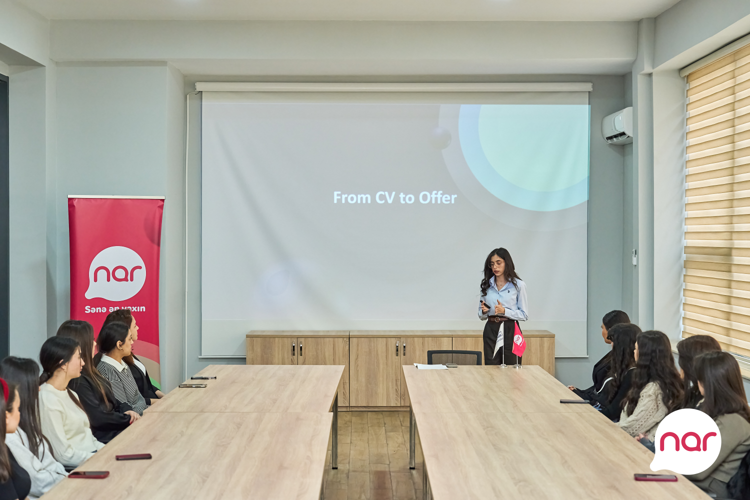“Nar”ın İnsan qaynaqları departamentinin peşəkar heyəti tərəfindən hazırlanan təlim proqramı texniki ixtisaslar üzrə təhsil alan tələbələrə rabitə sahəsi üzrə karyera perspektivləri, işə qəbul prosesi, real iş həyatında tələb olunan bacarıqlar barədə bilikləri əhatə edir. Semestr ərzində iki mərhələdə keçiriləcək təlim ümumilikdə 40 iştirakçını əhatə edir.