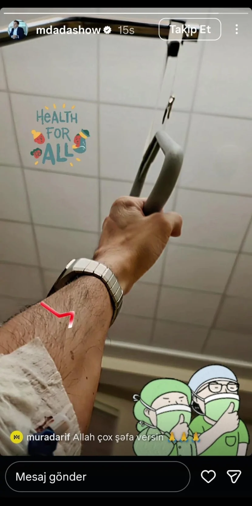 Dadaşov xəstəxanadan fotosunu paylaşıb və hamıya sağlamlıq arzuladığını yazıb.