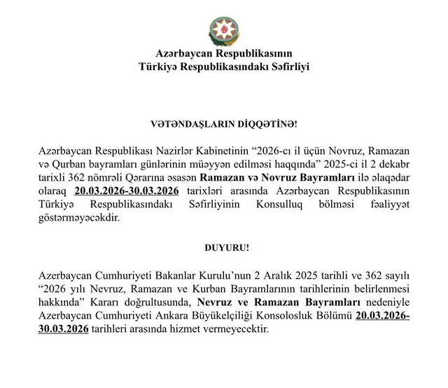 Bildirilib ki, Azərbaycanın Türkiyədəki səfirliyinin Konsulluq şöbəsi martın 20-dən 30-dək bağlı olacaq. Buna səbəb Nazirlər Kabinetinin müvafiq qərarına əsasən, Novruz və Ramazan bayramları ilə əlaqədar sözügedən tarixlərin qeyri-iş günləri olmasıdır.