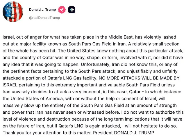 "Bu halda (əgər İran Qətərə hücum edərsə - red.), ABŞ İsrailin köməyi və razılığı ilə və ya olmadan bütün Cənubi Pars qaz yatağını kütləvi şəkildə partladacaq", - deyə Ağ Ev lideri bildirib.