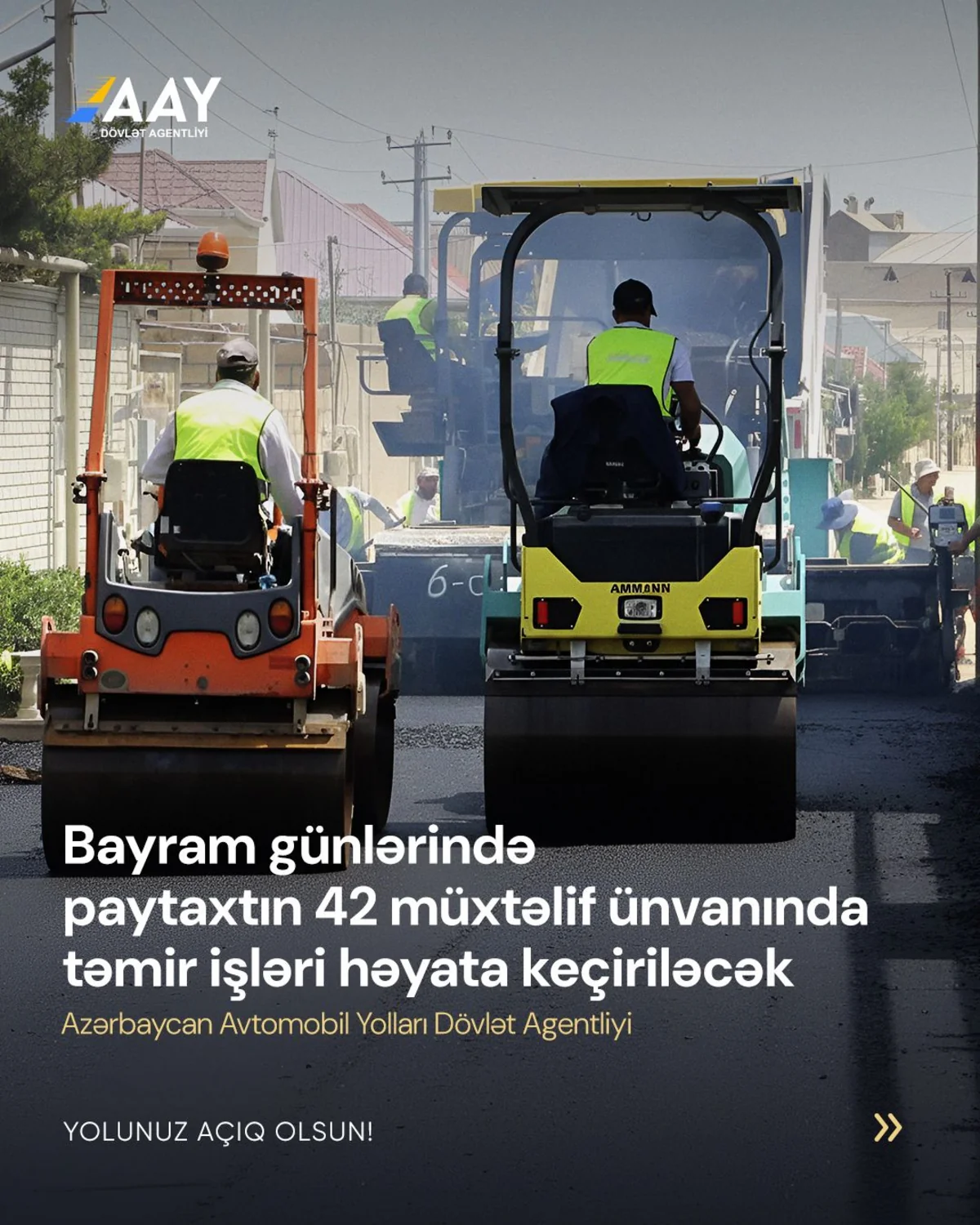 Bayram günlərində paytaxtın 42 müxtəlif ünvanında avtomobil yolları təmir olunacaq - FOTO