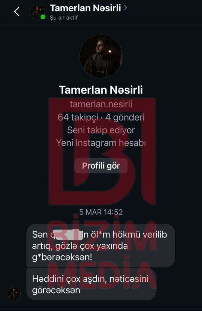 Moderator.az Bizim.Media-ya istinadən xəbər verir ki, sosial şəbəkədə Tamerlan Nəsirli adlı şəxs S. Bəkirqızına ard-arda ölüm təhdidlərinin yer aldığı mesajlar göndərib.