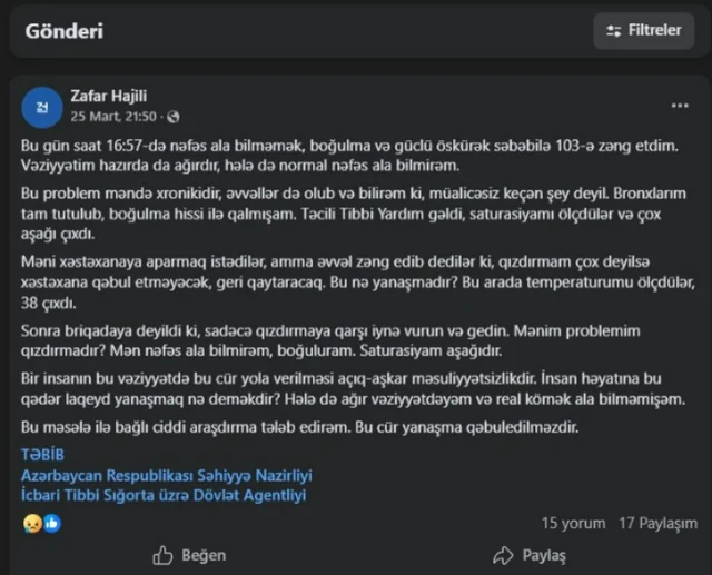 Yazdığına görə, təcili tibbi yardım gəlib, saturasiyanı ölçüblər və çox aşağı çıxıb. Lakin xəstəxanaya aparmayıblar. Ona bildirilib ki, qızdırma yüksək deyilsə, xəstəxana onu qəbul etməyəcək və geri qaytaracaq.