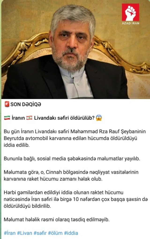 İranın Livandakı səfiri Məhəmməd Rza Rauf Şeybaninin bu gün Beyrutda avtomobil karvanına edilən hücumda öldürüldüyü iddia edilib.