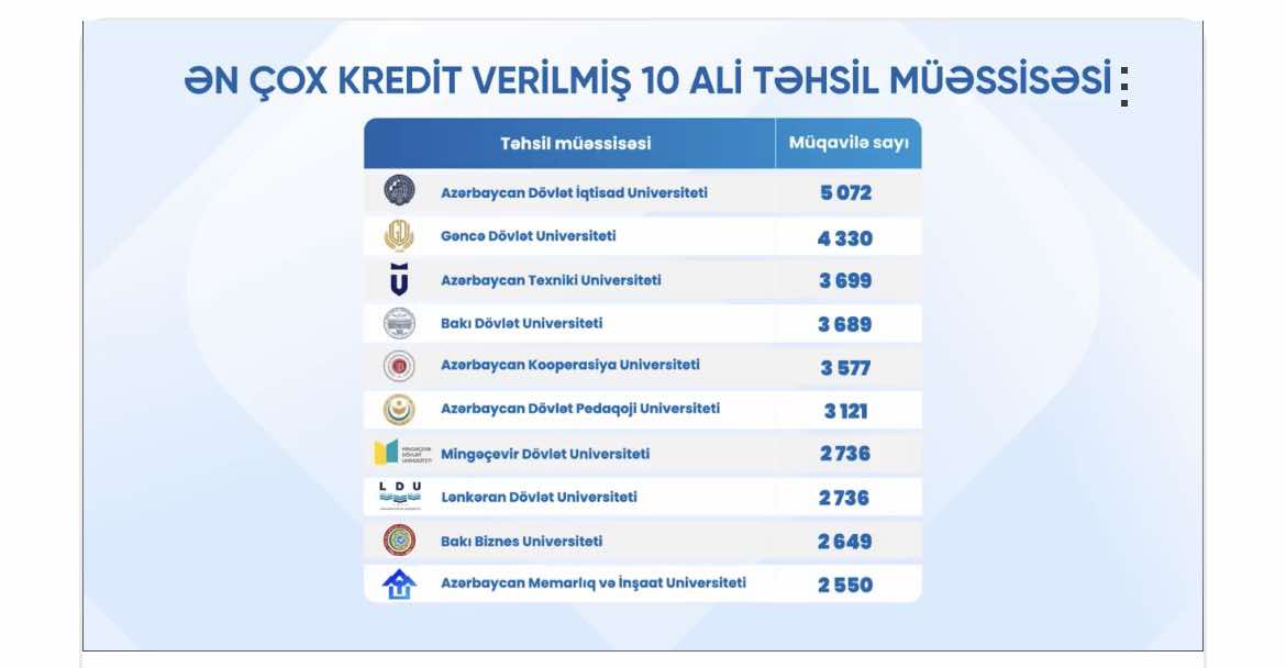 Nazir müavinin yayımladığı məlumatda ən çox təhsil krediti verilmiş 10 ali təhsil müəssisəsi də qeyd olunub.