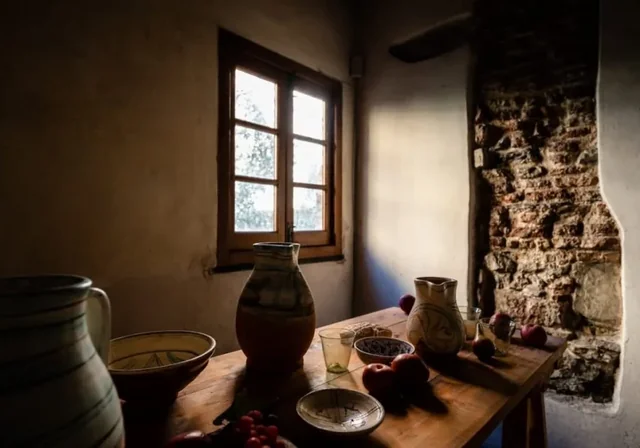 İkinci mərtəbədə yemək və yatmaq üçün istifadə edilən iki kiçikölçülü otaq var. Arxadakı ən sol küncdə, ehtimal ki, gündəlik yemək bişirmək üçün istifadə edilən ocağın yerini kobud yonulmuş daş əvəzləyib. "Bu ocaq, ailənin sadə və qənaətcil həyat tərzini əks etdirir. Çox güman ki, burada yemək hazırlanırdı, yeməklər isə yuxarıdakı daha böyük otaqlarda yeyilirdi. Orada iki sadə otaq, ehtimal ki, yemək və yataq yeri kimi xidmət edirdi", - deyə muzeyin əməkdaşı bildirir.