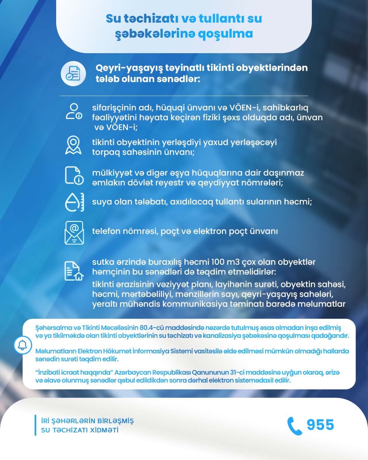 Bu dəfə təqdim etdiyimiz məlumatda su təchizatı və tullantı sularının axıdılması sisteminə qoşulma üzrə tələb olunan sənədlərin siyahısı ilə tanış ola bilərsiniz.