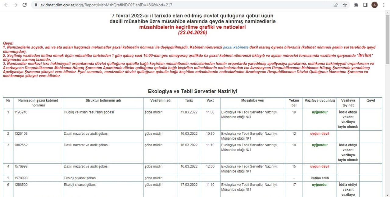 Məsələn, 7 fevral 2022-ci ildə “dövlət qulluğuna qəbul üçün daxili müsahibə” keçirilməsi barədə elan verilir. Namizədlər qeydə alınır və mart ayında müsabiqələr başlayır.