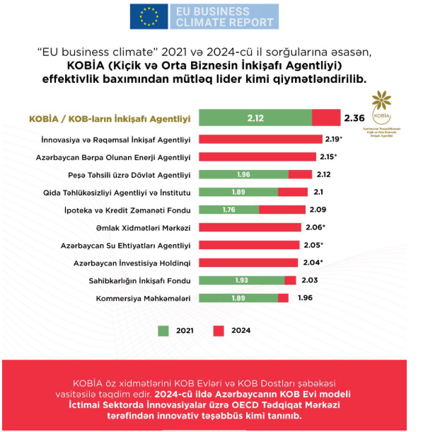 “Kiçik və Orta Biznesin İnkişafı Agentliyi  Avropa İttifaqının dəstəyi ilə hazırlanan “EU Business Climate Report: Azerbaijan 2024” hesabatında effektivlik baxımından bütün dövlət qurumları arasında birinci sırada qərarlaşdı. Bu, Azərbaycanda KOB sektoruna yönəlmiş və KOBİA tərəfindən icra edilən institusional siyasətin artıq ölçülə bilən real təsir yaratdığını və bunun beynəlxalq səviyyədə tanındığını göstərir. Son illər KOBİA tərəfindən sahibkarlıq mühitinin sadələşdirilməsi, xidmətlərin modernləşməsi və biznes-dövlət əlaqələrinin çevikləşməsi istiqamətində atılan addımlar öz praktiki nəticəsini verir”