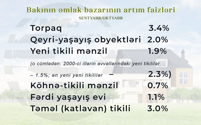 "Oktyabr ayında torpaq sahələrinin qiyməti 3.4%, qeyri-yaşayış obyektlərinin qiyməti isə 2% artıb. Yeni tikili mənzillərdə ümumi artım 1.9% təşkil edib. 2000-ci illərin əvvəllərində tikilmiş binalarda qiymətlər 1.5%, ən yeni tikililərdə isə 2.3% yüksəlib. Köhnə tikililərdə artım 0.7%, fərdi yaşayış evlərində 1,1%, təməl mərhələsində (kotlovan) olan layihələrdə isə 3% olub", - deyə ekspert vurğulayıb.