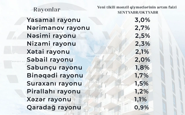 Bakıda daşınmaz əmlak bazarında qiymət artımı tendensiyası güclənməkdə davam edir. Oktyabr ayında şəhərin bütün rayonlarında qiymətlər sentyabrla müqayisədə yüksəlib və bu artım həm mənzil və fərdi yaşayış evləri, həm torpaq sahələri, həm də qeyri-yaşayış obyektləri üzrə müşahidə olunub.