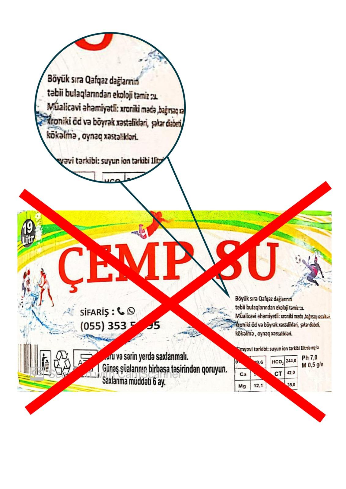 Bildirilib ki, baxış zamanı müəssisədə qablaşdırılan “ÇEMP Su” əmtəə nişanlı suların etiket məlumatlarında suyun mənbəyinin “Böyük Qafqaz sıra dağlarının bulaqlarından ekoloji təmiz su”dan əldə edildiyi qeyd olunsa da, mərkəzləşdirilmiş su sistemindən gələn suları filtr etməklə qablaşdırıldığı müəyyən edilib. Eyni zamanda, müəssisənin qida sahəsində normativ hüquqi aktların tələblərinə cavab vermədiyi, qanunvericiliyə zidd olaraq məhsulların üzərində “müalicəvi” sözünün qeyd olunduğu, ehtiyat su çəninin, filtrlərin, qablaşdırma avadanlığının müvafiq qaydalara uyğun təmizlənməsi, mexaniki filtrlərin, kömür və qum filtrlərinin dəyişilməsi ilə bağlı qeydiyyatın aparılmasına dair təsdiqedici sənədlərin olmadığı, qida məhsulları ilə təmasda olan avadanlıqların yuyulması üçün nəzərdə tutulmayan kimyəvi maddədən istifadə olunduğu aşkarlanıb.