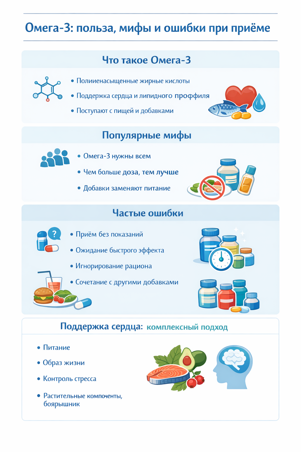 Ən çox rast gəlinən səhvlərdən biri əlavəni sadəcə "faydalıdır" düşüncəsi ilə məqsədsiz qəbul etməkdir. Digər səhv isə tez nəticə gözləməkdir. Omega-3 qısa müddətdə hiss olunan effekt vermir, onun təsiri uzunmüddətli qidalanma vərdişləri ilə birlikdə qiymətləndirilir.
