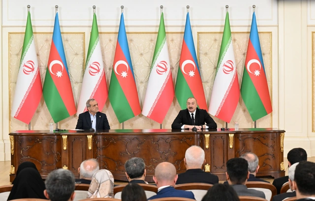 Azərbaycan Respublikasının Prezidenti İlham Əliyev və İran İslam Respublikasının Prezidenti Məsud Pezeşkian mətbuata bəyanatlarla çıxış edirlər.