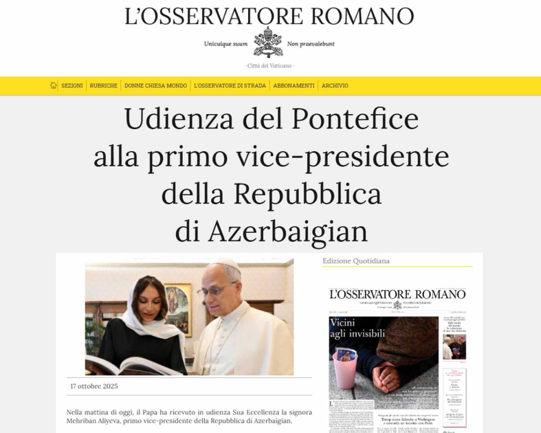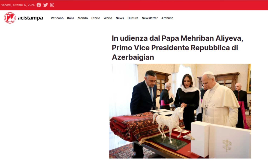 Müqəddəs Taxt-Tacın və İtaliyanın aparıcı mətbu orqanları Azərbaycanın Birinci vitse-prezidenti Mehriban Əliyevanın Vatikana rəsmi səfəri çərçivəsində oktyabrın 17-də Roma Papası XIV Leo ilə görüşünə geniş yer ayırıb.