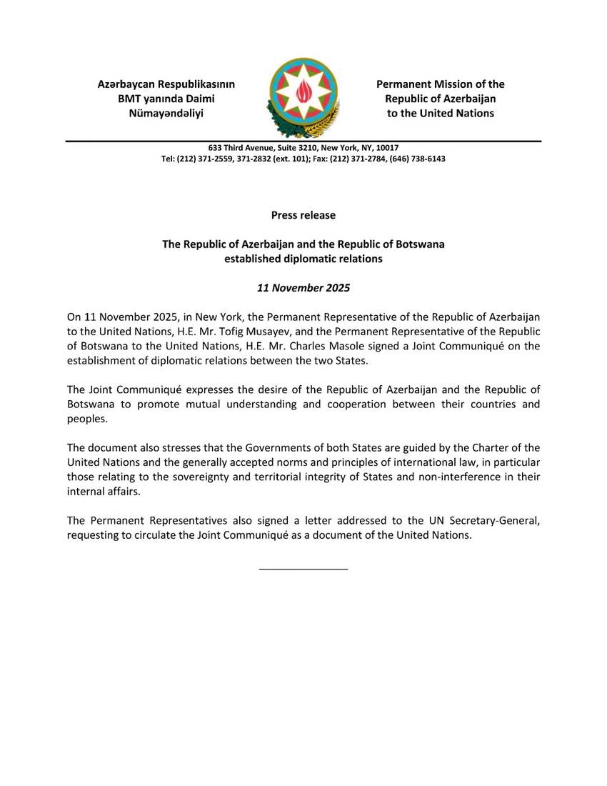 Bəyanatda deyilir: "11 noyabr 2025-ci il tarixində Nyu-Yorkda Azərbaycanın BMT-dəki daimi nümayəndəsi Tofiq Musayev və Botsvananın BMT-dəki daimi nümayəndəsi Çarlz Masole iki ölkə arasında diplomatik münasibətlərin qurulması haqqında Birgə Kommünike imzalayıblar".