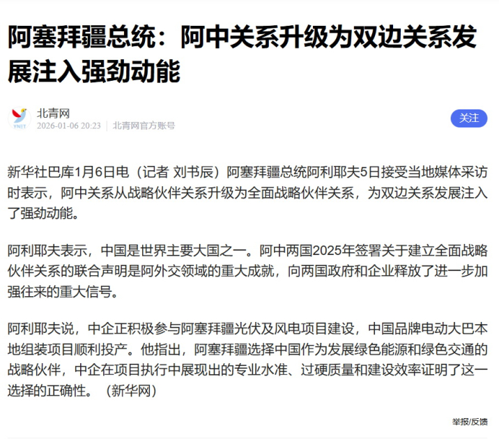 Moderator.az xəbər verir ki, “Azərbaycan Prezidenti Çinlə hərtərəfli strateji tərəfdaşlığı yüksək qiymətləndirir” adlı Çin və ingilis dilində hazırlanan xəbərdə dövlətimizin başçısının iki ölkə arasında hərtərəfli strateji tərəfdaşlıq münasibətlərinin qurulmasını böyük uğur kimi dəyərləndirdiyi qeyd olunub. Vurğulanıb ki, Azərbaycan Prezidenti hərtərəfli strateji tərəfdaşlığın iki ölkə arasında iqtisadi əlaqələrin inkişafına böyük təkan verdiyini, biznes və dövlət strukturlarına əlaqələri fəallaşdırmaq üzrə ciddi impuls verdiyini deyib.
