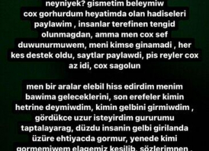 Depressiyadayam, danışmağa halım yoxdur. Neyləyək, qismətim belə imiş. Həyatımda olan hadisələri paylaşmağa çox qorxurdum, amma mən çox səhv düşünmüşəm, məni kimsə qınamadı, hər kəs dəstək oldu. Yüngül əməliyyat keçirəcəm, bu, ağır əməliyyata hazırlıq olacaq. Dualarınız mənimlə olsun.