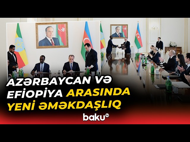 Затем с участием Президента Азербайджана Ильхама Алиева и премьер-министра Эфиопии Абия Ахмеда Али министр иностранных дел Азербайджана Джейхун Байрамов и министр иностранных дел Эфиопии Гедион Тимотеос подписали "Соглашение между Азербайджанской Республикой и Правительством Федеративной Демократической Республики Эфиопия о сотрудничестве в оборонной сфере" и "Меморандум о взаимопонимании по сотрудничеству в организации тридцать второй сессии Конференции Организации Объединенных Наций по изменению климата (COP32)".