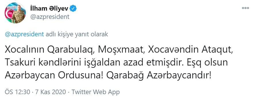 Bunu Prezident İlham Əliyev özünün tvitter hesabında yazıb.